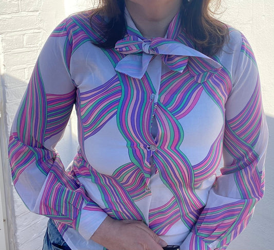 Vintage 70s pussy bow cotton & polyester blouse from Co-Op lilac white print size 10 12