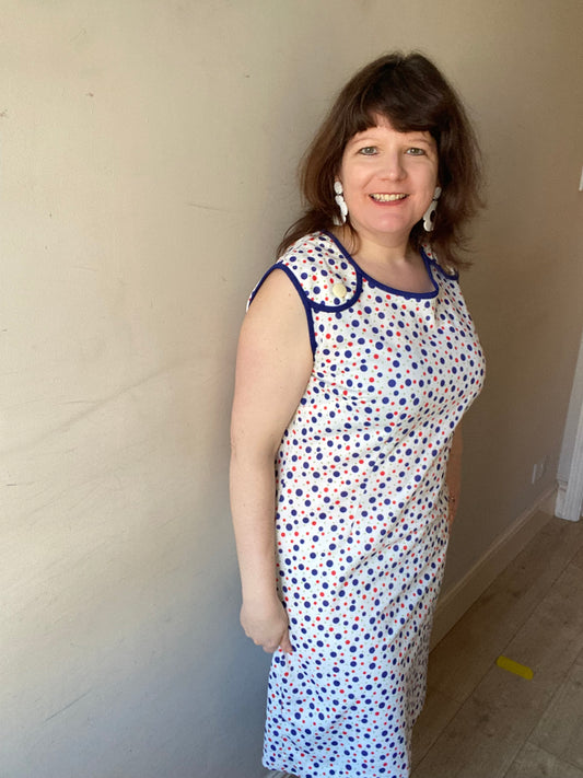 Vintage 60s blue white red spot print dress size 20 polyester sleeveless button detail