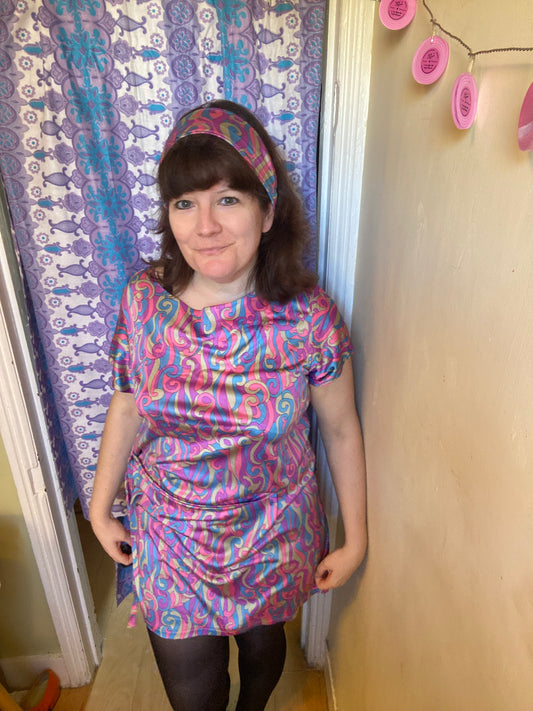 Vintage 60s Psychadelic pink blue print mini dress size 20 22 with matching belt & headband