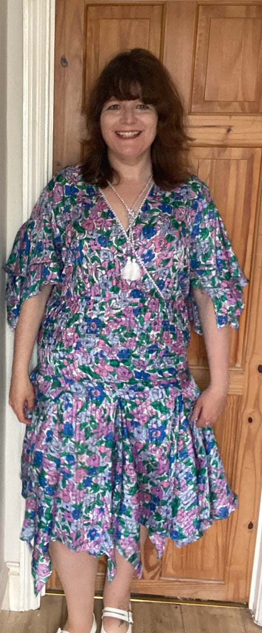 Vintage Diane Freis floral 80s bead dress with hankerchief hem size 16 purple blue