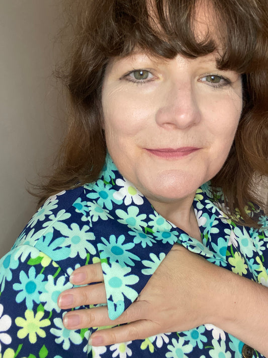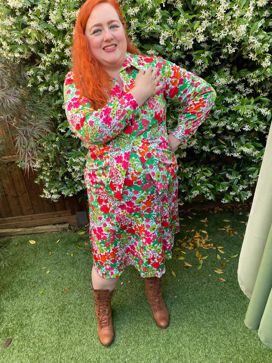 Vintage handmade floral polyester short sleeve shirt dress with dagger collar size 16 18 blue green white