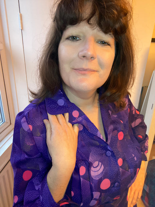 Vintage Diolen 70s purple print mini dress size 16 polyester long sleeves