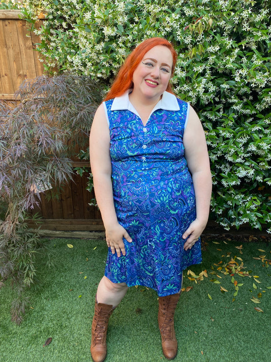 Vintage 60s 70s summer dress button front purple blue size 18 20