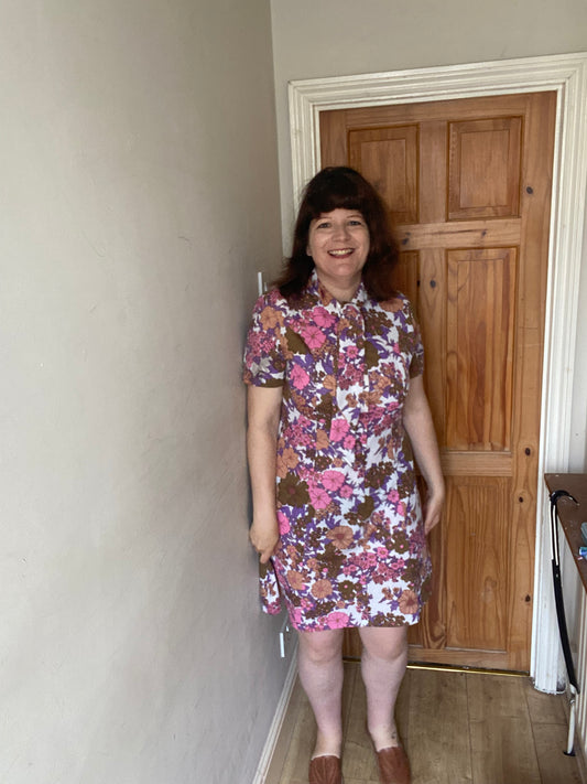 Vintage handmade 60s pink white purple floral print tie neck dress buttons size 16 polyester short sleeves