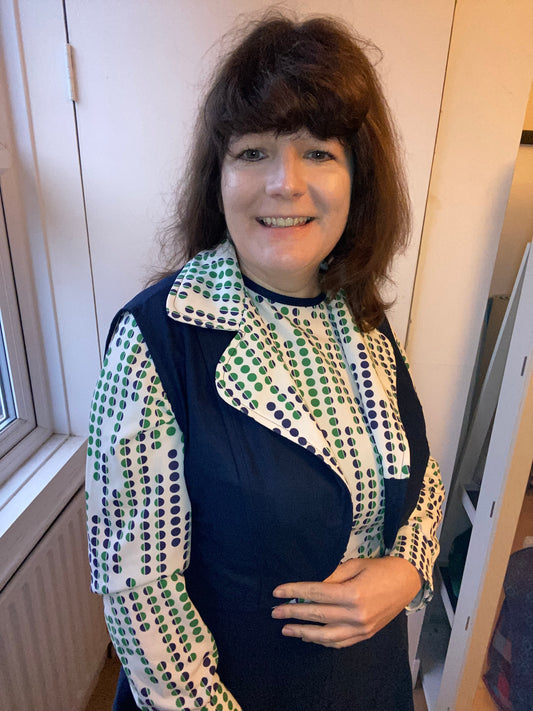 Vintage blue green white C&A 60s 70s waistcoat dress suit two piece polyester size 18 20