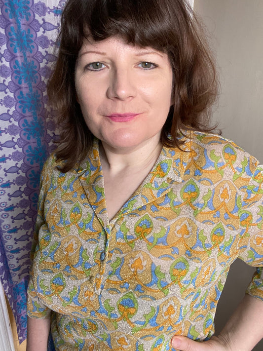 Vintage 70s 80s Luisa Spagnoli Perugia sparkly Lurex print blouse size 18 20 yellow green blue