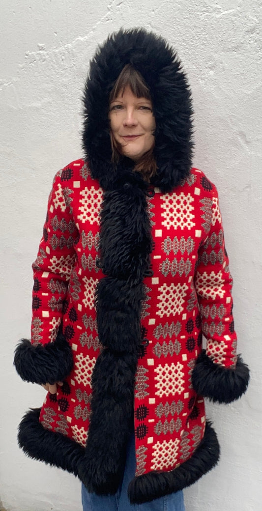Vintage Welsh Wool Tapestry faux fur trim long hooded coat Pandy Red white grey up to size 16