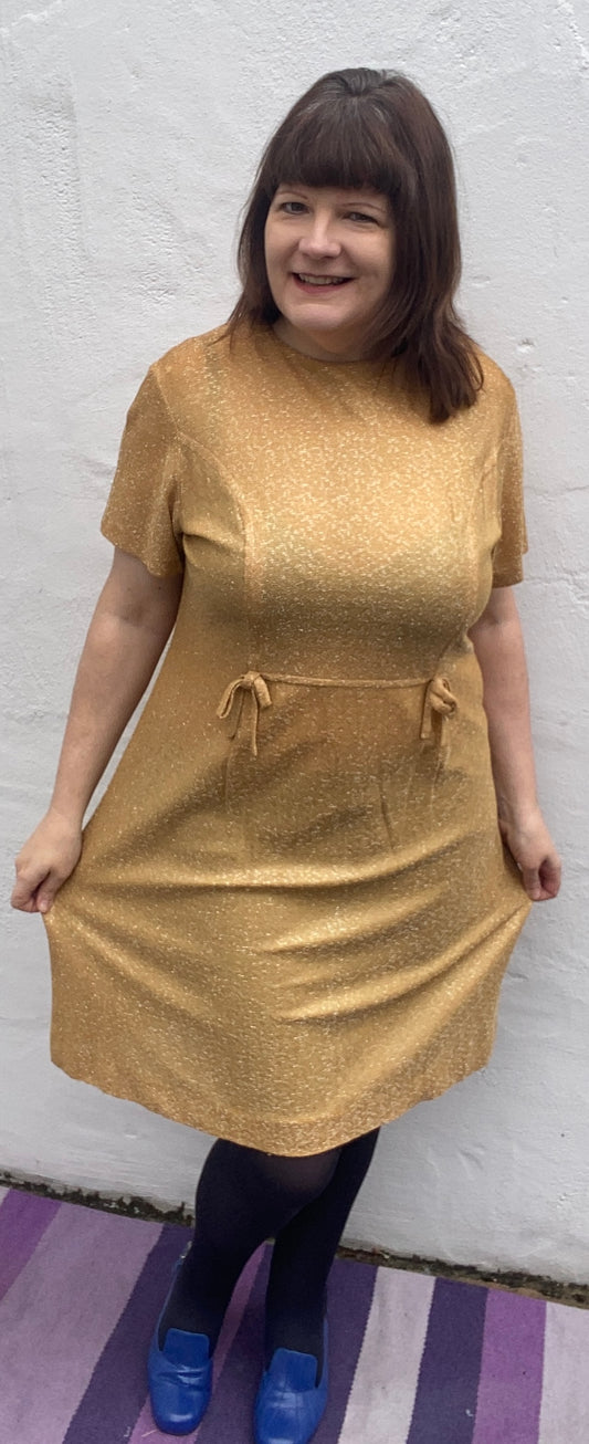 Vintage 60s 70s glitter gold evening shift dress with bow detail polyester short sleeves size 20