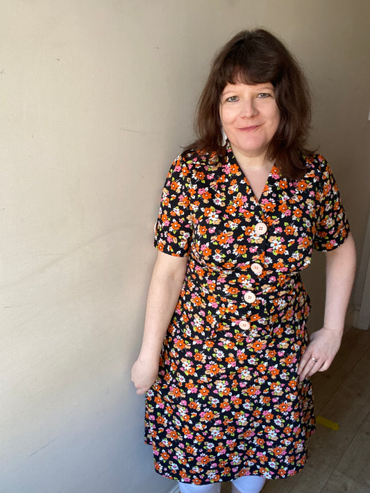 Vintage orange 80s floral print peplum dress size 16 polyester short sleeves