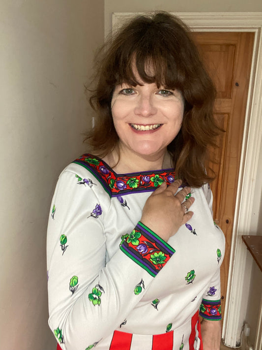 Vintage 70s square neck floral print dress long sleeves white purple red green size 18