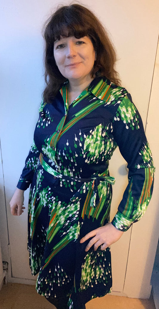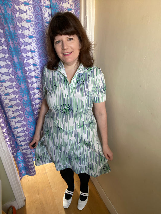 Vintage 60s 70s polyester green white dress with collar size 16 18