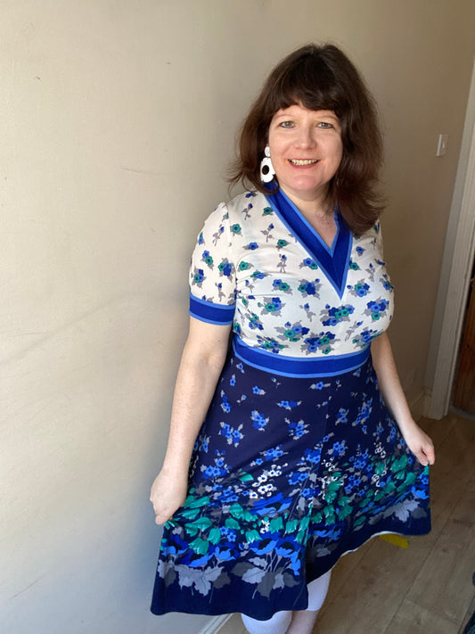 Vintage 70s blue white floral print dress size 16 polyester short sleeves