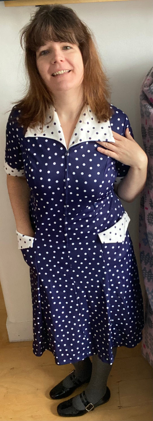 Vintage 70s navy blue white spot polka dot print dagger coller zip front dress polyester size 18 short sleeves