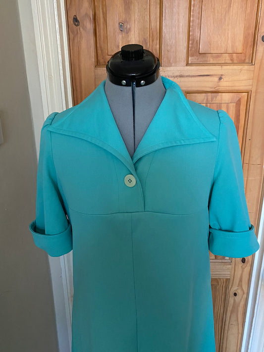 Vintage turquoise aqua blue 70s short sleeve polyester collar dress by Linzi size 14 16