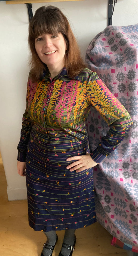 Vintage Teal blue black print 60s dress jacket suit two piece Sydney Crouch End Label size 16