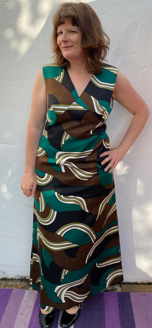 Vintage 70s green white brown print sleeveless polyester maxi dress with v neck and print front size 16 Grahl Modell label