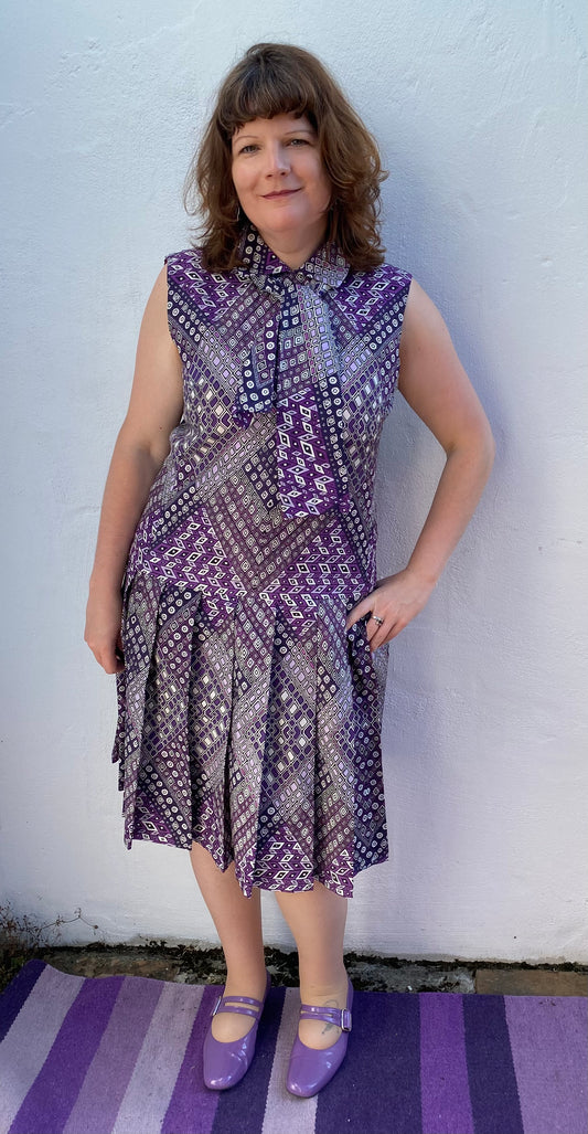 Vintage Handmade polyester silk 60s 70s geometric print pleated dress size 14 16 purple lilac tie