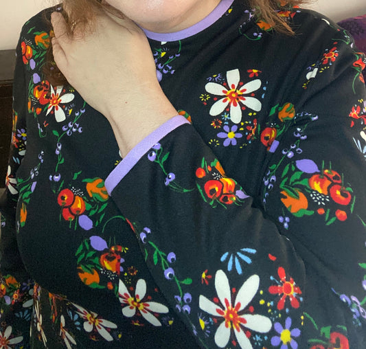 Vintage black purple lilac floral print crimplene polyester 70s skater dress button detail size 14 16