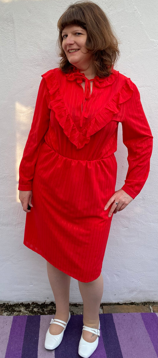 Vintage 80s red polyester frill dress with long sleeves size 14 16