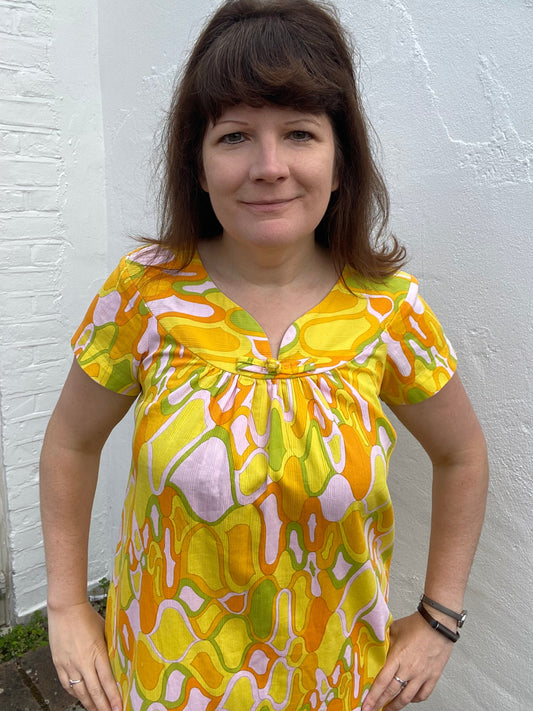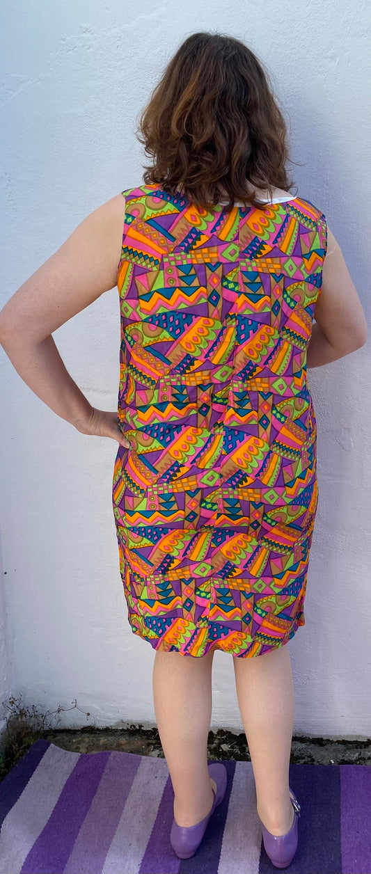 Vintage handmade multi coloured silky shift dress pink blue orange sleeveless size 14 16