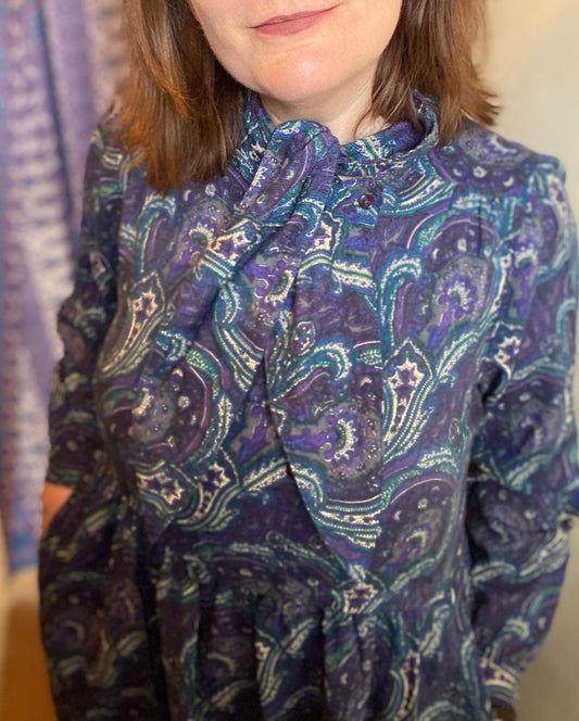 Vintage Liberty print wool dress blue paisley 80s tie neck dress long sleeves size 16