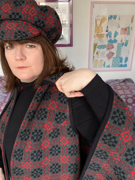 Vintage black red Welsh Wool Tapestry short cape zip front waistcoat size 12 14 16
