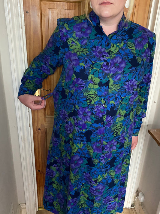 Vintage 80s floral midi dress by Joanna Frances button front blue green purple long sleeves size 18