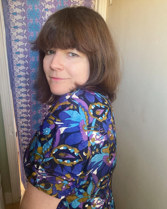 Vintage 70s purple blue purple psychedelic print handmade polyester silk feel midi dress with short sleeves size 14 16