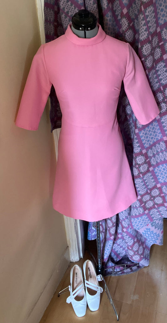 Vintage Ann Michael 60s polyester high neck 3/4 sleeves mini dress pink size 10