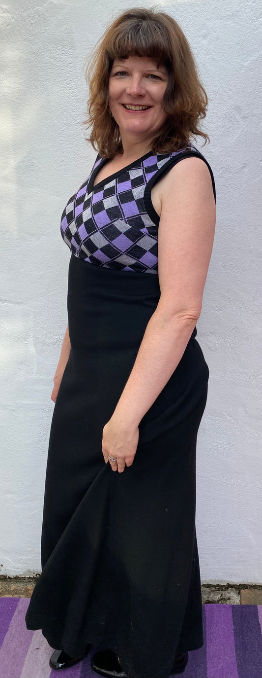 Vintage 70s purple black Argyle check print sleeveless jesersy / wool maxi dress with v neck size 14