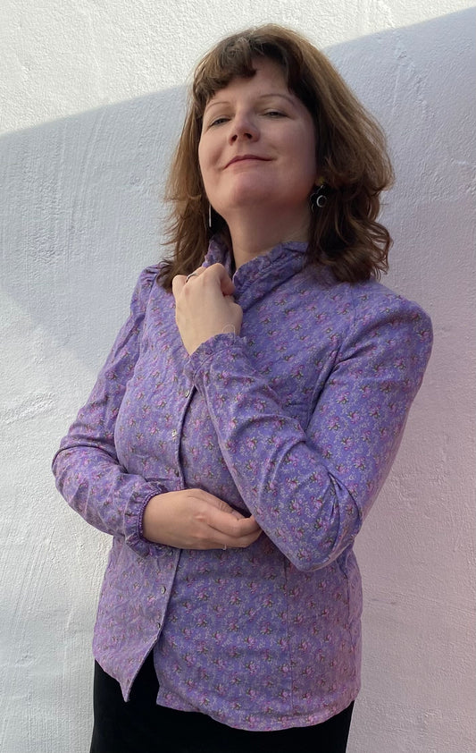 Vintage 70s 80s Laura Ashley Wales purple light print cotton shirt blouse frill size 12 14 cottagecore
