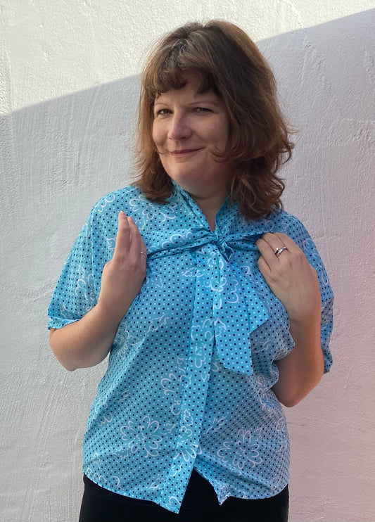 Vintage 80s pussy bow polyester blouse from Debenhams light blue white print size 18
