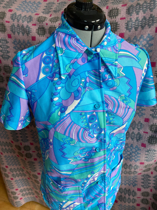 Vintage Blue purple white psychedelic print polyester shirt blouse collar short sleeves beach size 10 12