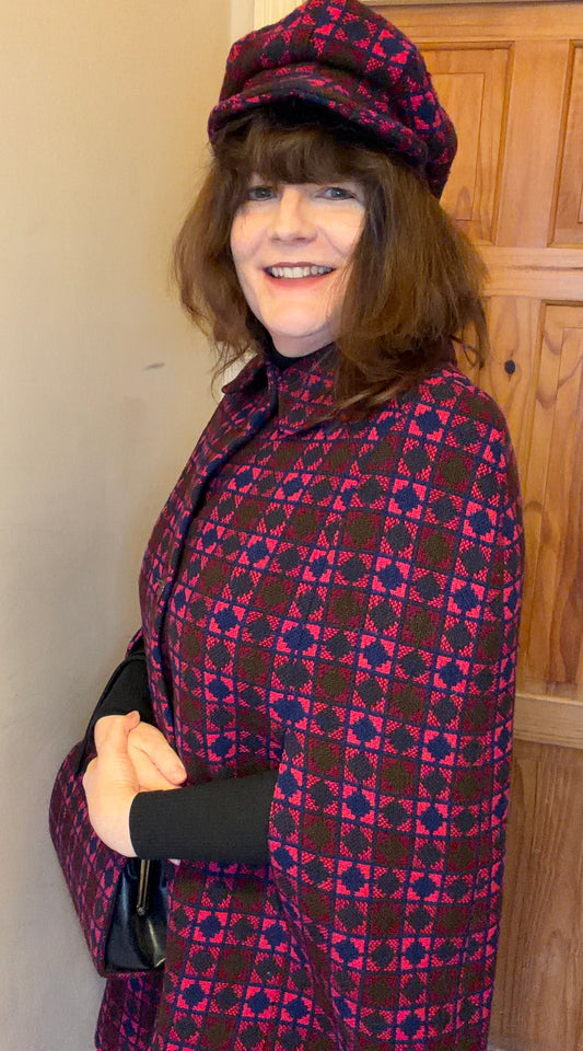 Vintage Welsh Wool Tapestry baker boy hat pink purple geometric print size M medium