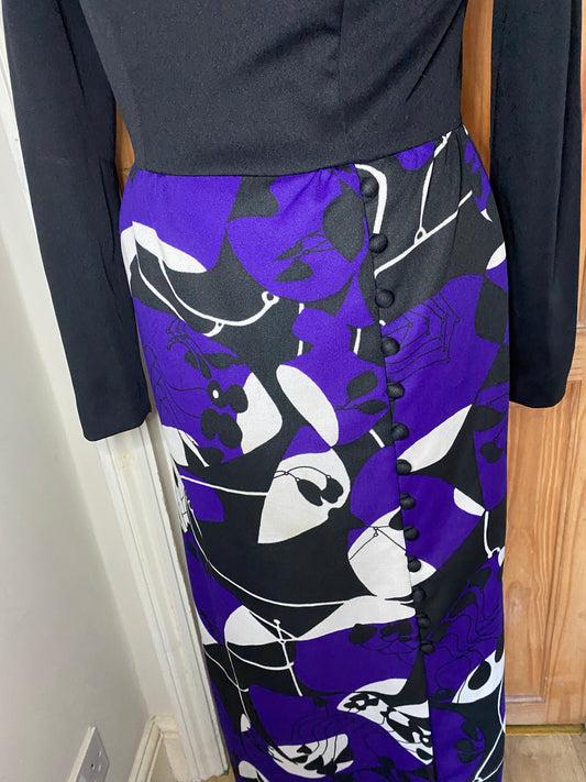 Vintage 70s polyester black purple white print long sleeve maxi dress split buttons size 14