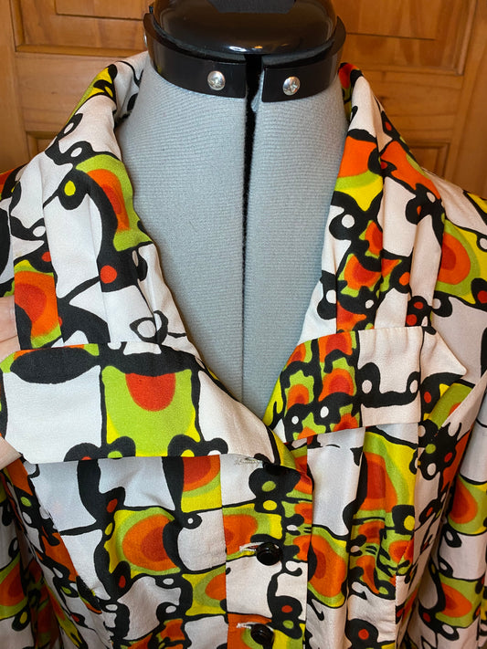 Vintage 70s polyester hand made funky print white orange green black mad collar dress size 14