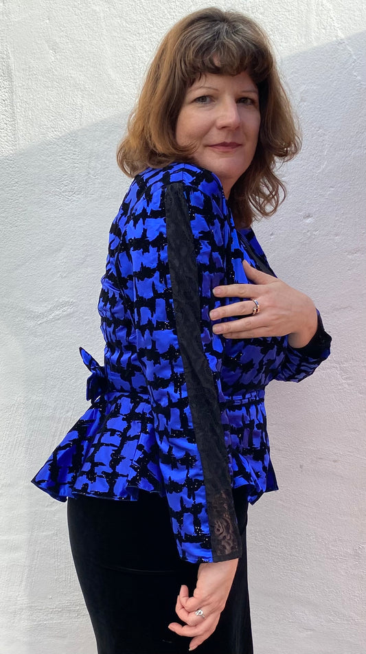 Vintage Blue Black Dorothy Perkins 80s evening jacket peplum bow lace sleeves cropped size 10