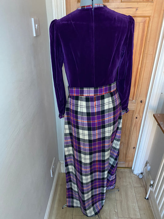Vintage 70s purple velvet wool tartan print long sleeve maxi dress size 14 Ceilidh Christmas