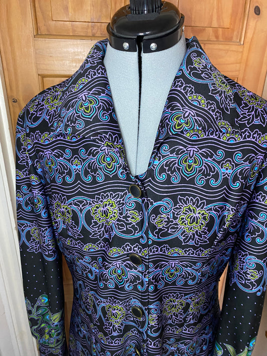 Vintage 60s 70s Welsh Wool Tapestry Jacket portcullis print purple blue white size 10 12 pockets Jon Ro Fashions