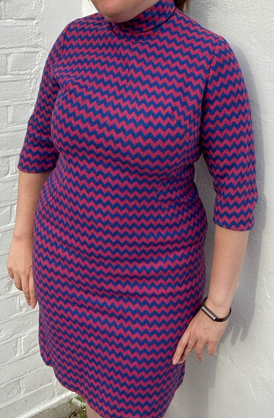 Vintage Handmade wool mix 60s Barbie style zigzag print shift dress size 14 pink blue