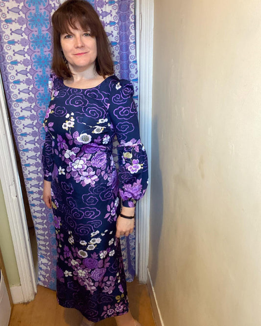 Vintage Long sleeve puff shoulder floral polyester purple 70s maxi dress size 10 12