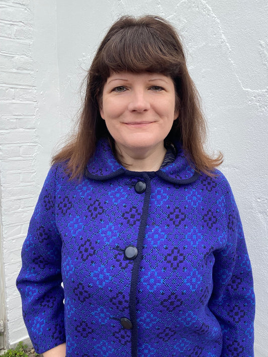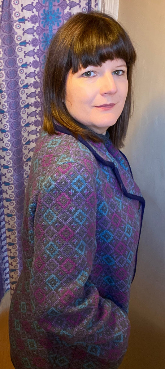 Vintage Welsh Wool Tapestry Pea coat jacket purple blue size14 Reseta geometric print pockets