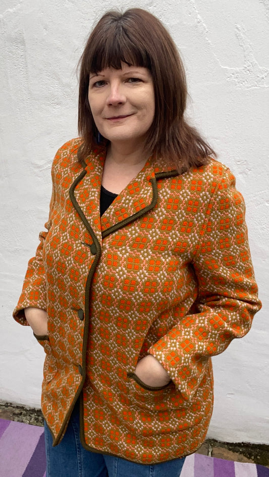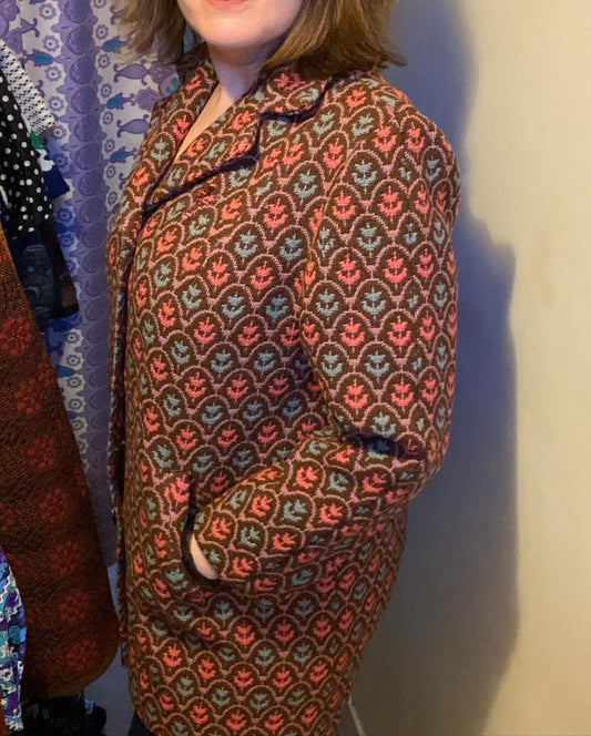 Vintage welsh wool tapestry pea car coat brown orange blue 40 inch chest 60s size 14
