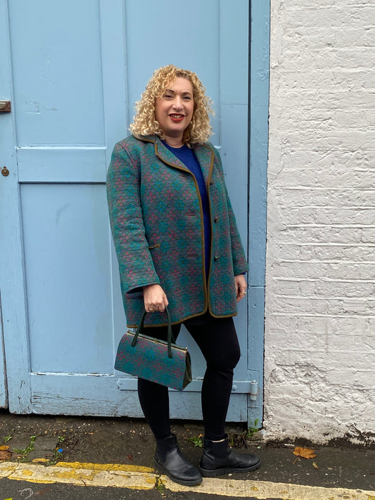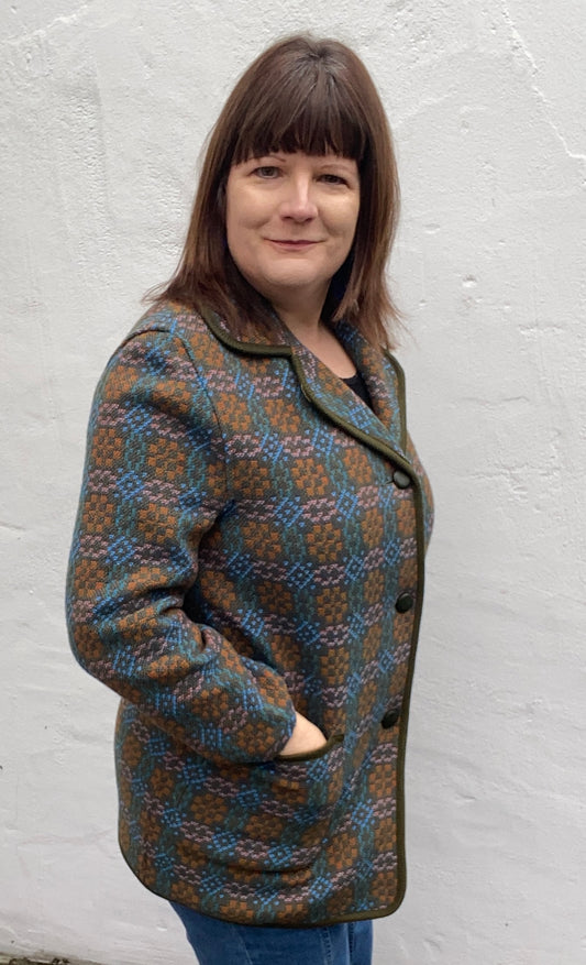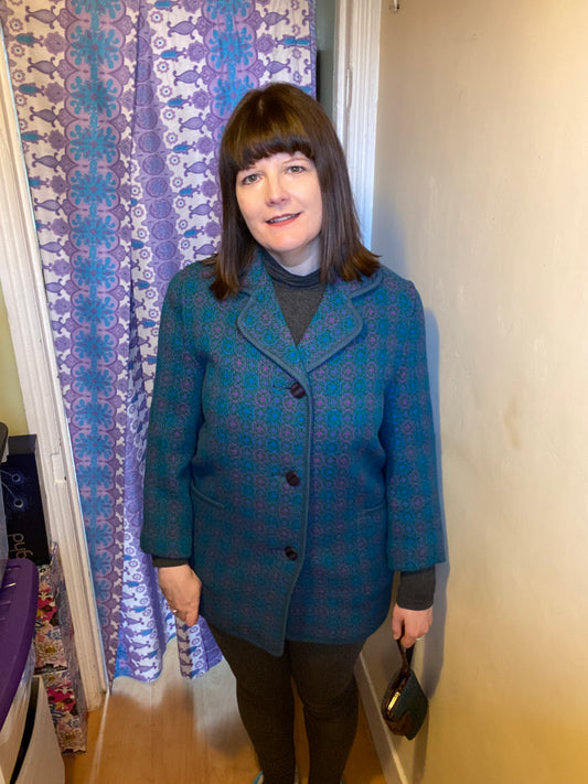 Vintage Welsh Wool Tapestry coat blue teal size 16 geometric print green