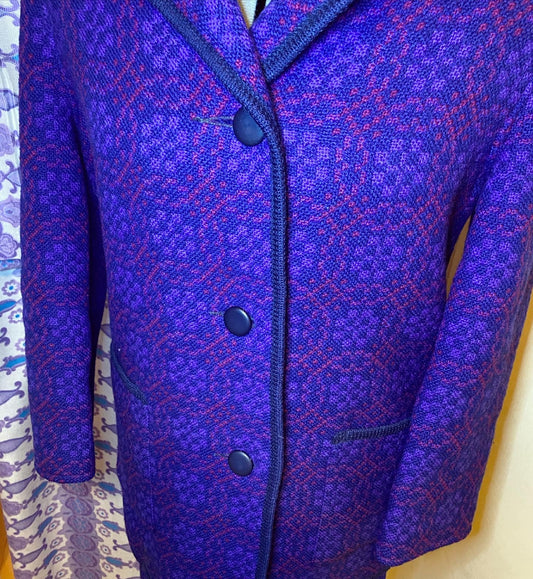 Vintage 60s Welsh wool Tapestry pea coat purple geometric print size 12 pockets Jon Ro fashions
