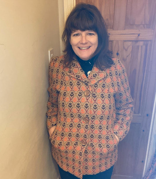 Vintage Brynkir Print Welsh Wool Tapestry Pea coat orange brown flower size 14 16