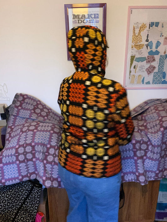 Vintage Welsh Wool Tapestry Bomber Jacket hood Orange Black Yellow size 10