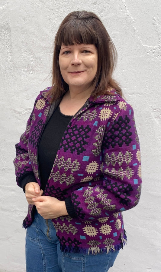 Vintage 60s 70s Welsh Wool Tapestry Jacket zip portcullis print purple white size 12 14 pockets Jon Ro Fashions