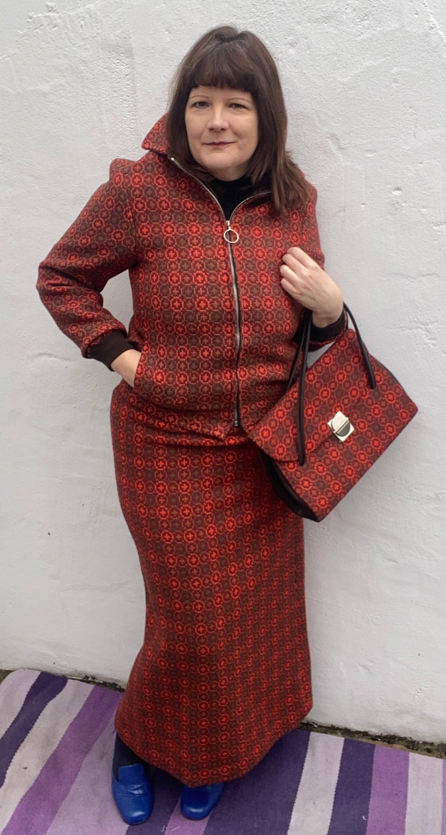 Matching to jacket and other clothing in stock. Leather and wool handbag great condition. Orange & brown print.