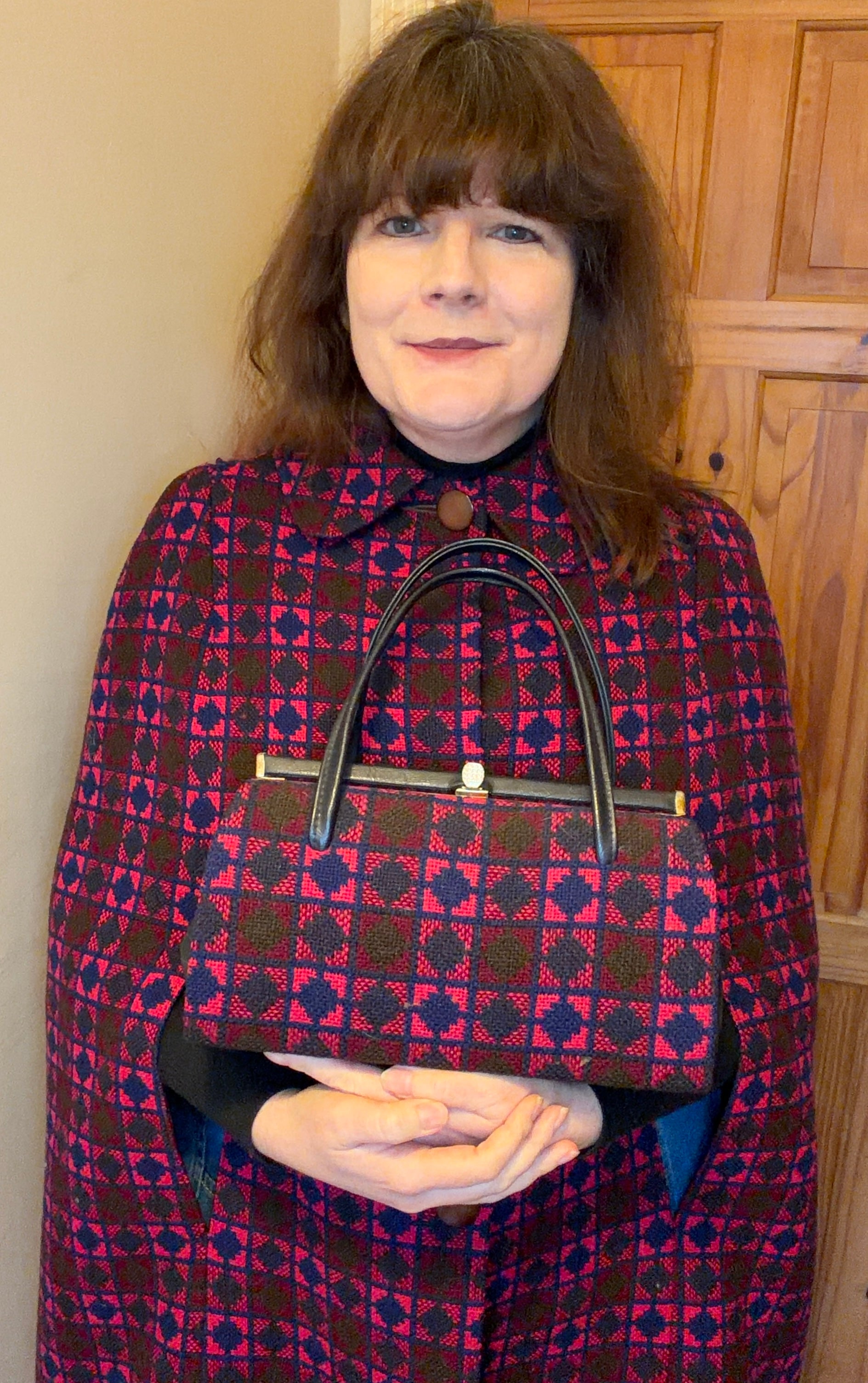 Vintage pink & purple geometric print Welsh Wool Tapestry handbag structured bag